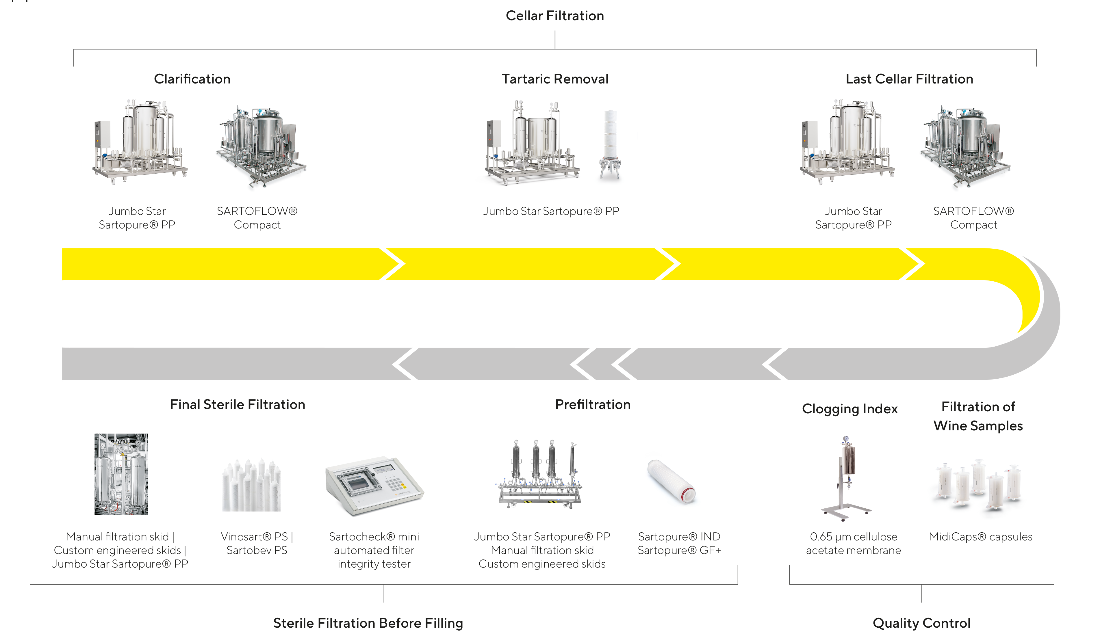 Sartoflow? systems designed for wine clarification and final cellar filtration. The hollow-fiber technology provide enhanced flow performance for heavy red wines. Scale up concept based on multiple module options.