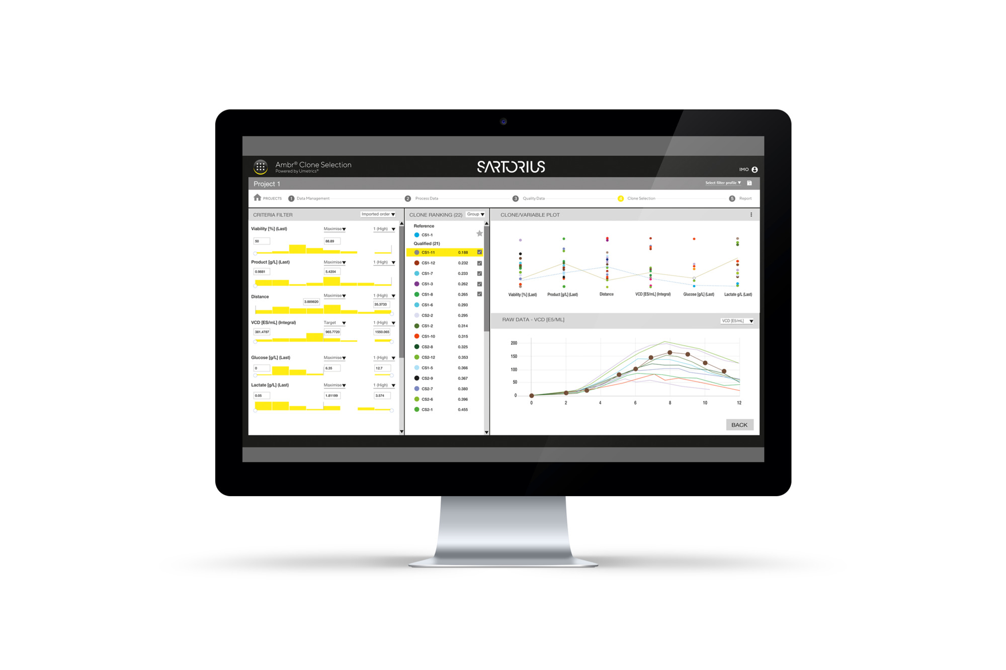 Users define the selection criteria such as cell density, product titer, and key product quality attributes and assign priority weightings in order to screen and rank clones. The application uses a unique multivariable desirability assessment feature for clone ranking.